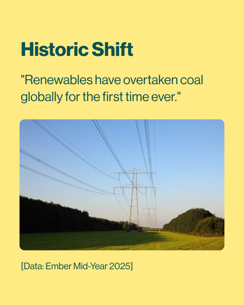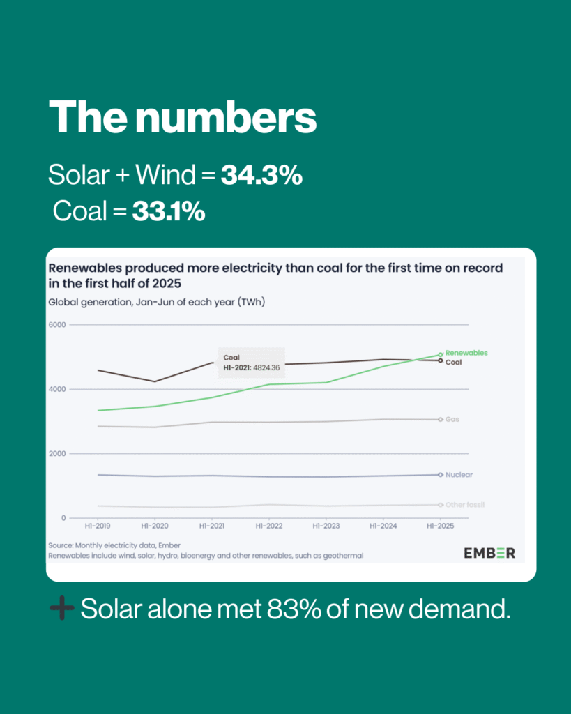 For the first time in history, renewables generated more electricity globally than coal in the first half of 2025. 📊