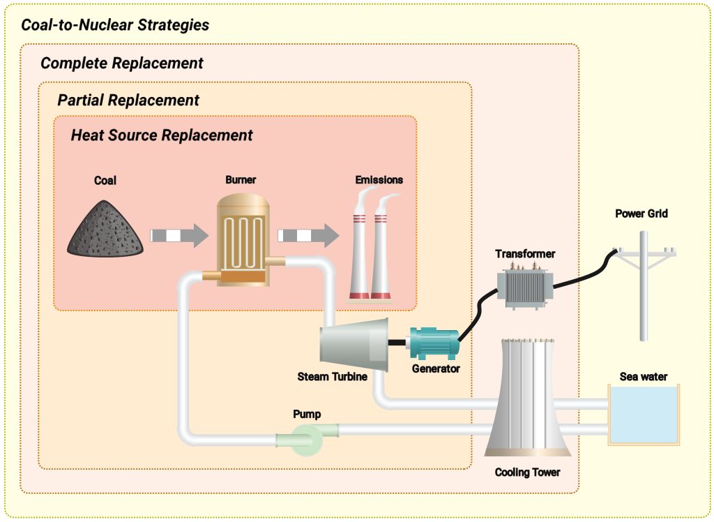 • Heat-source replacement: replacing the coal boilers with advanced nuclear reactors while keeping the steam turbines and other equipment. This approach would require high-temperature or sodium-cooled fast reactors capable of supplying sufficient heat for existing turbines.