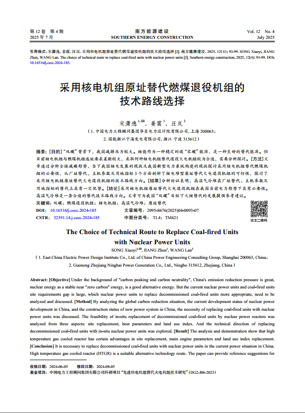 A new study published in Southern Energy Construction by the East China Electric Power Design Institute (China Power Engineering Consulting Group) analyses which reactor types are best suited to replace decommissioned coal-fired units on existing sites.