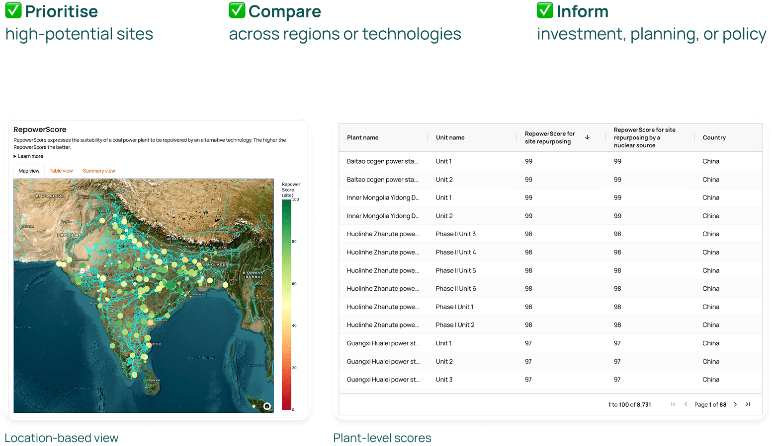 - Policy-makers- Gain insights into which coal plants in your region are best suited for clean repowering and align decisions with national decarbonisation goals.